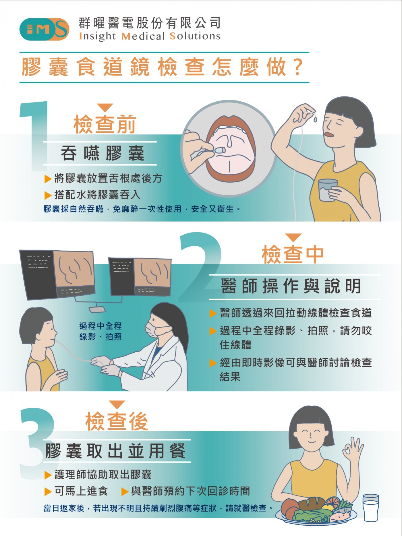 患者於醫師指導下吞服膠囊 → 反覆觀察食道且無不適感 → 影像即時回傳 → 醫師判讀結果。 全程約 5分鐘,無需恢復期,完成後即可恢復日常活動。