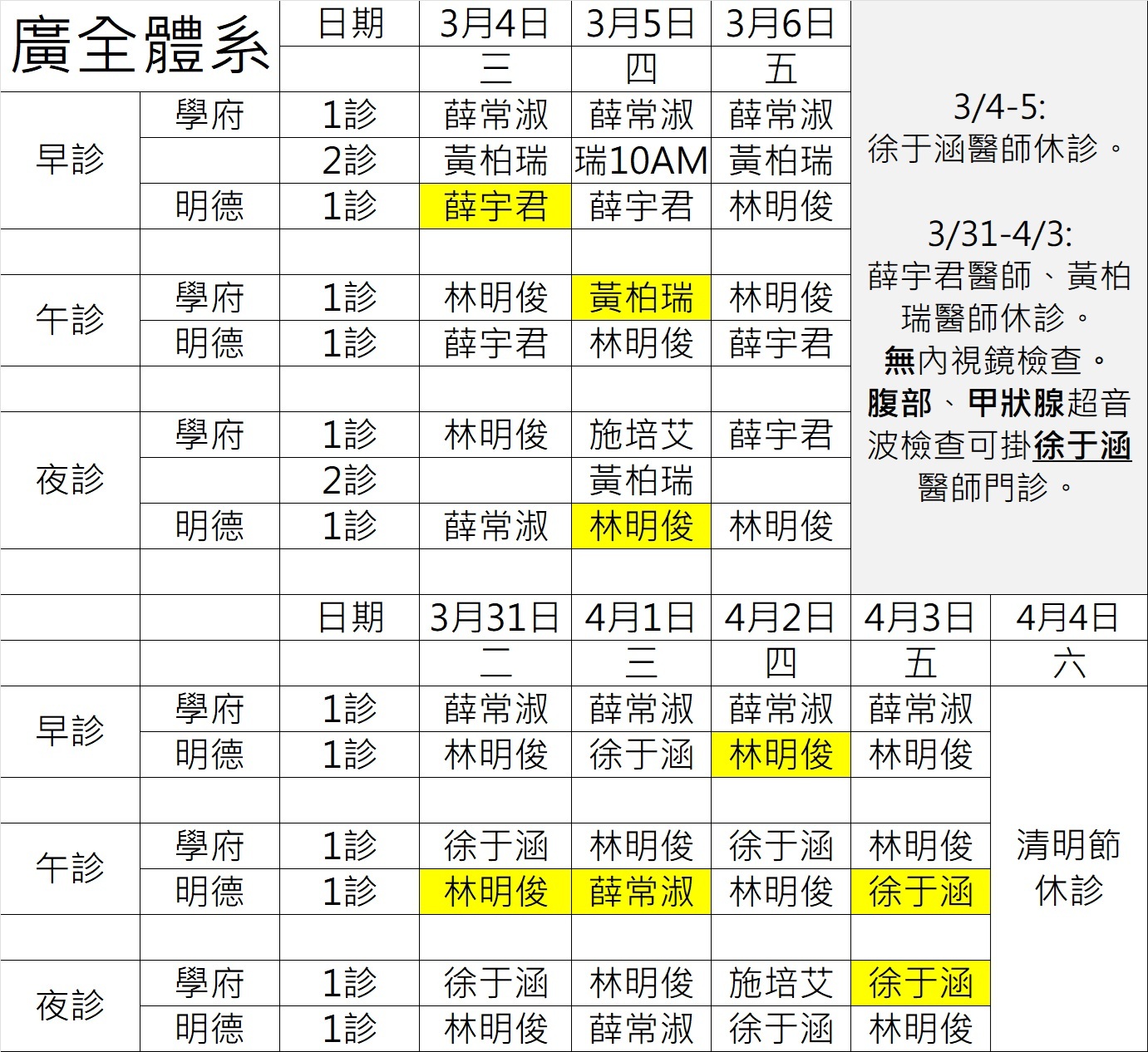 薛宇君醫師、黃柏瑞醫師:3/31(二)-4/3(五)休診;休診時期,廣全診所無內視鏡檢查;有甲狀腺超音波/腹部超音波追蹤需求者,可掛徐于涵醫師門診。