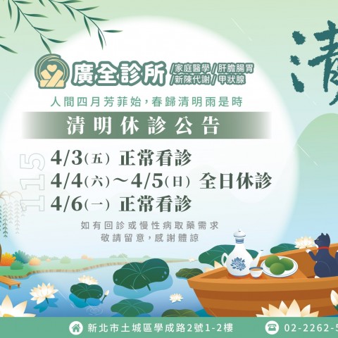 廣全診所及廣詮診所於114年05月31日(六)端午節休診一天,請有就醫需要之民眾改日再來。 廣全體系祝您 端午佳節愉快~